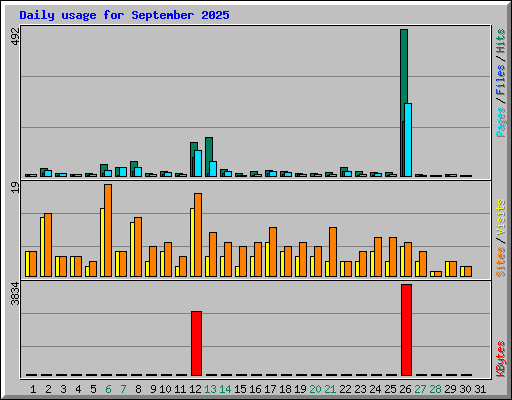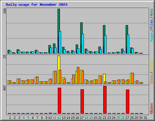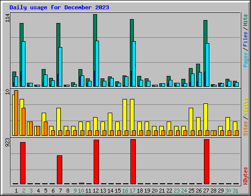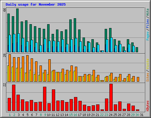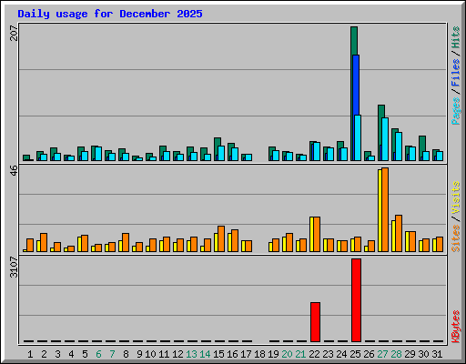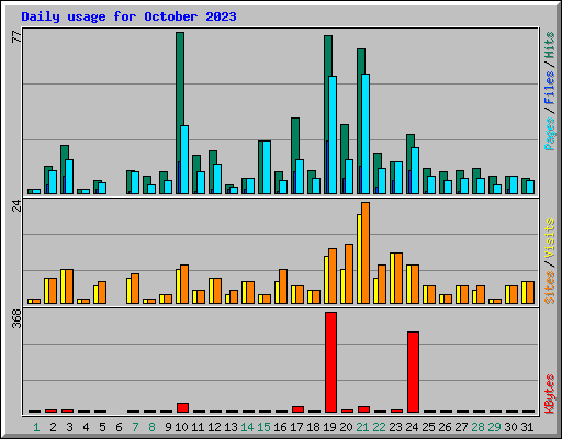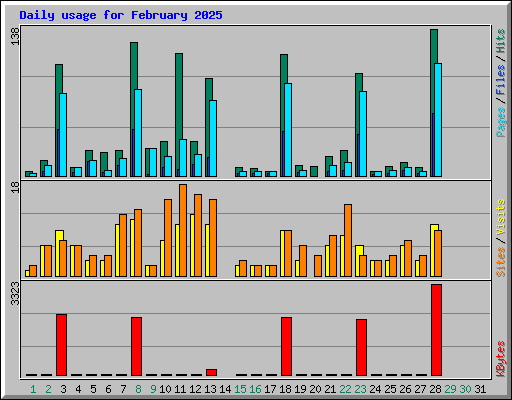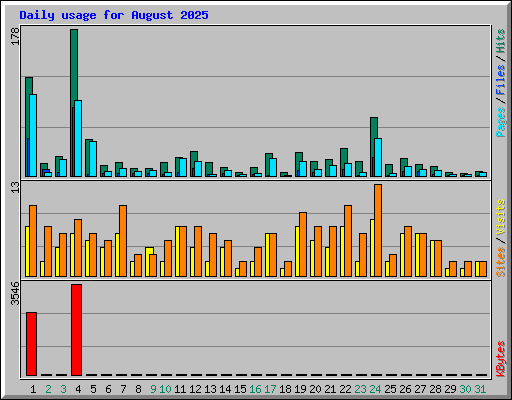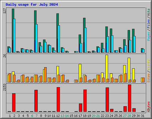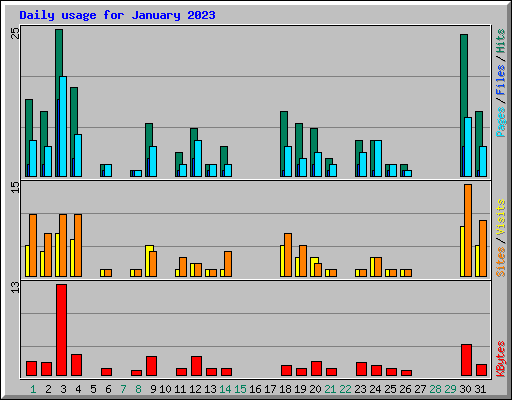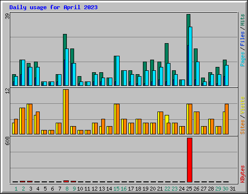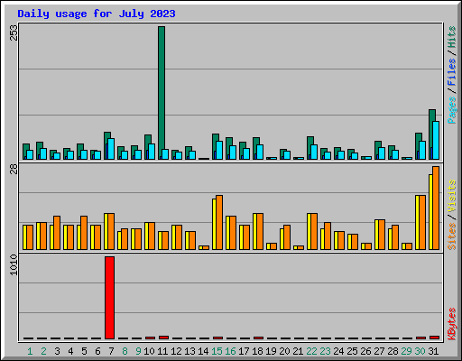 | Day | Hits | Files | Pages | Visits | Sites | KBytes | ||||||